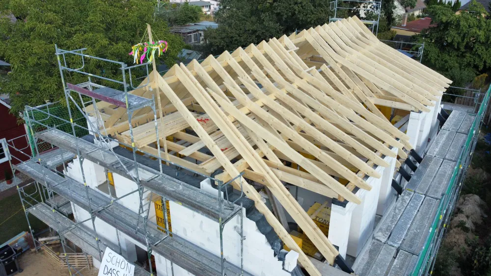 Richten des Dachstuhls eines Doppelhauses in Dallgow-Döberitz